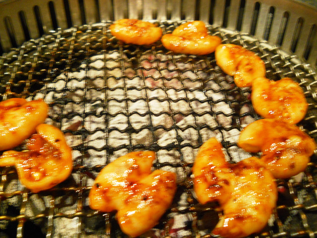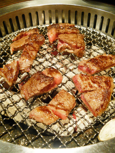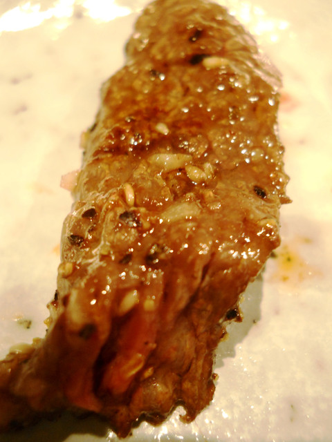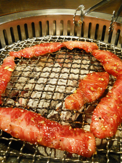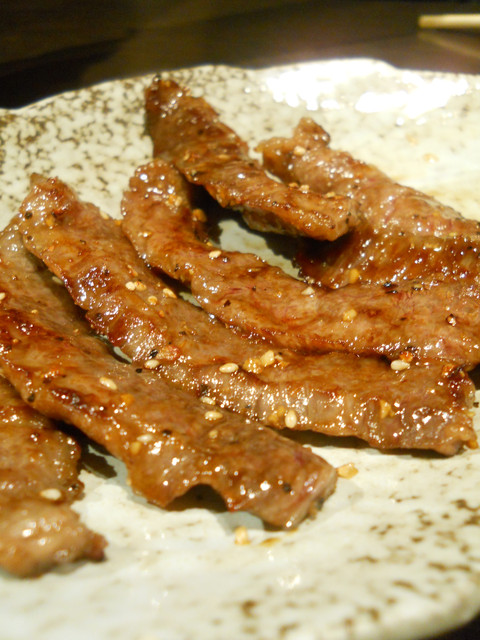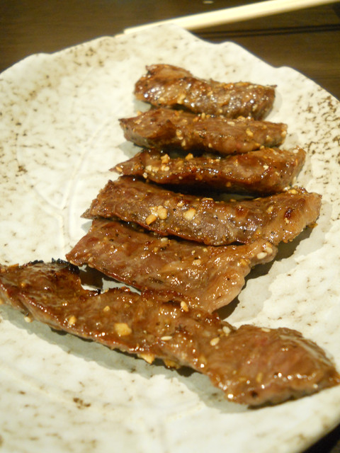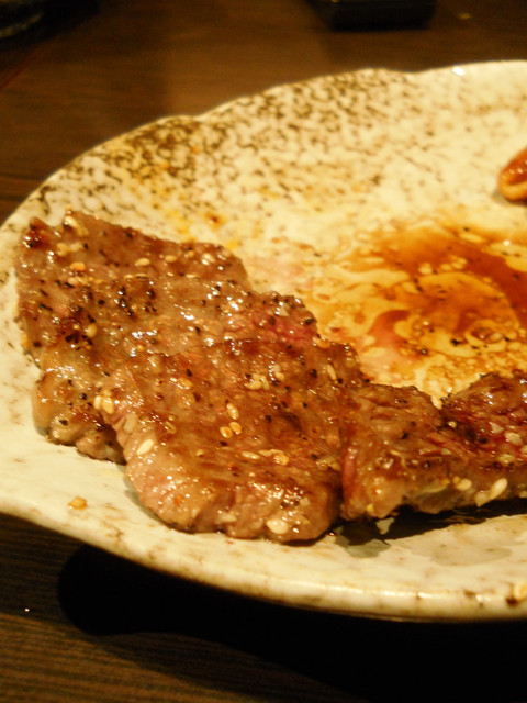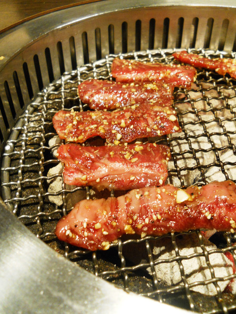 經過嚴型烤打的橫隔膜就是這張誘人的長相xd吃起來肉味頗重,還帶著些許的咬勁,越咬越是香氣十足。另外在嘴裡還會飄散淡淡像是烤肉醬的醃料味,幫我們烤的正妹刻意在烤架上多放了幾秒,也讓這肉烤好是帶了一點點焦香,這更加襯托出濃濃的肉香,雖然他並不是小虎最愛的一塊肉,但也是每次都必點的=)