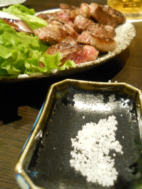 這麼說好了,這塊肋眼牛排絕對是物超所值,剛入口時可以發現那輕灑的海鹽和經過微烤的牛肉表面竟起了輕微的化學變化,這就像是我們在吃西瓜時總要灑上一點點鹽來引出更多甜味似的,所以這一口咬下肉汁立刻四下亂竄,這可忙壞了亂捉它們的舌頭。