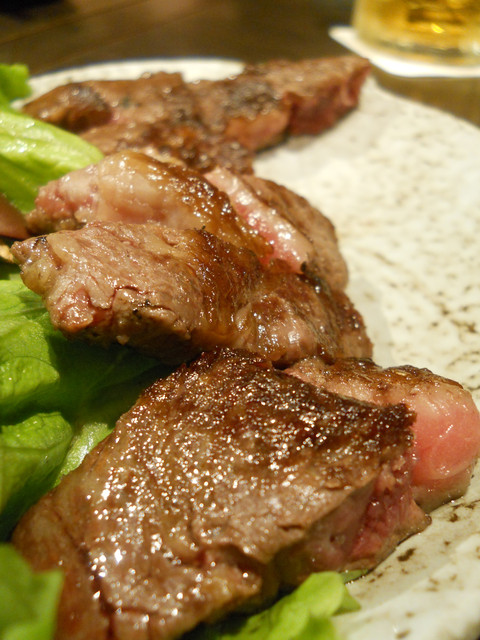 接下來這塊肉,因為是吃了兩三回合後加點的,我也搞不太清楚是那個部位的肉,但隱約記得我們有點板翼肉。這塊小虎曾在初推文中【燃-日式燒烤】中提起過,但當時我和「甘曉珈」點的是牛排(貴上100元)。這塊板翼基本上是屬於比較偏瘦的部份,這從上面的照片應該很容易就看出來才對。