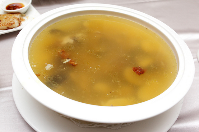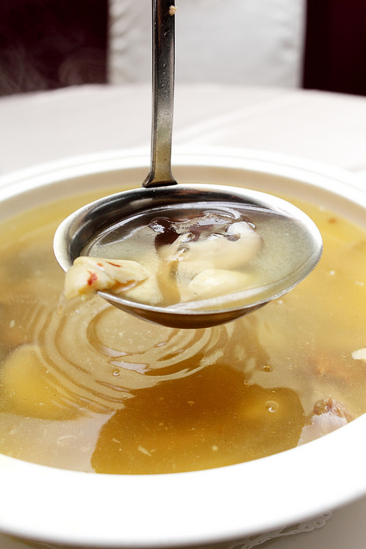 看似濃郁的雞湯喝起來卻很清爽甘甜,但蒜香仍舊濃厚