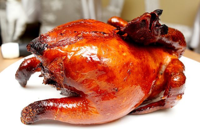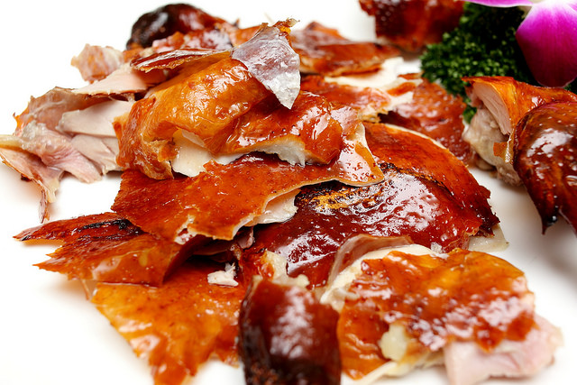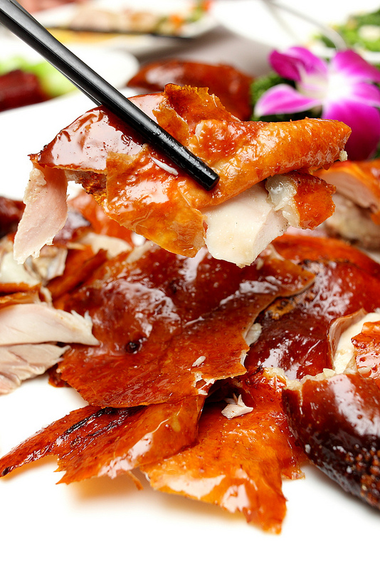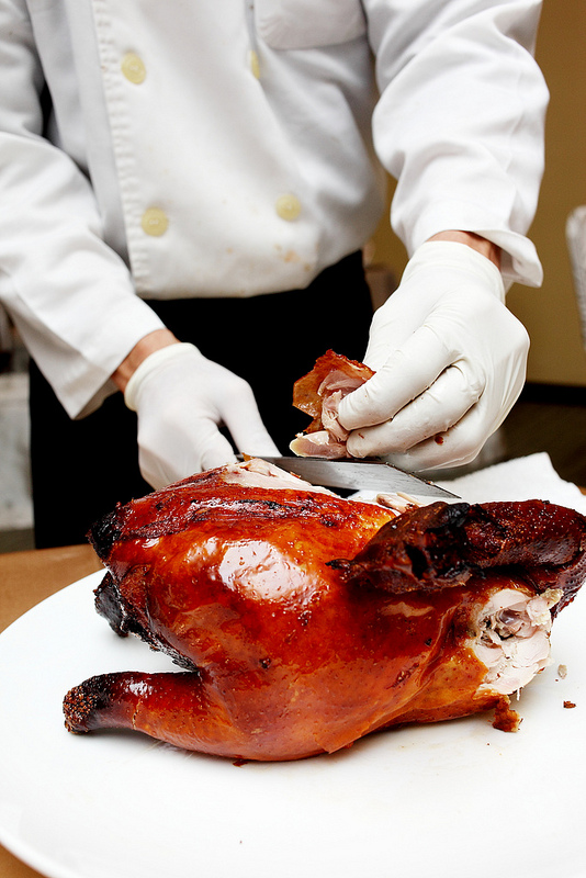 再淋上麥芽糖與醋水,再進明爐烘烤50分鐘,保持表皮酥脆,上桌由廚師為您作桌邊服務