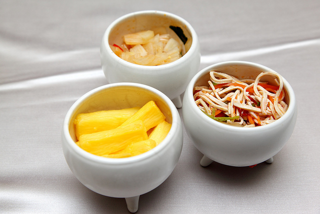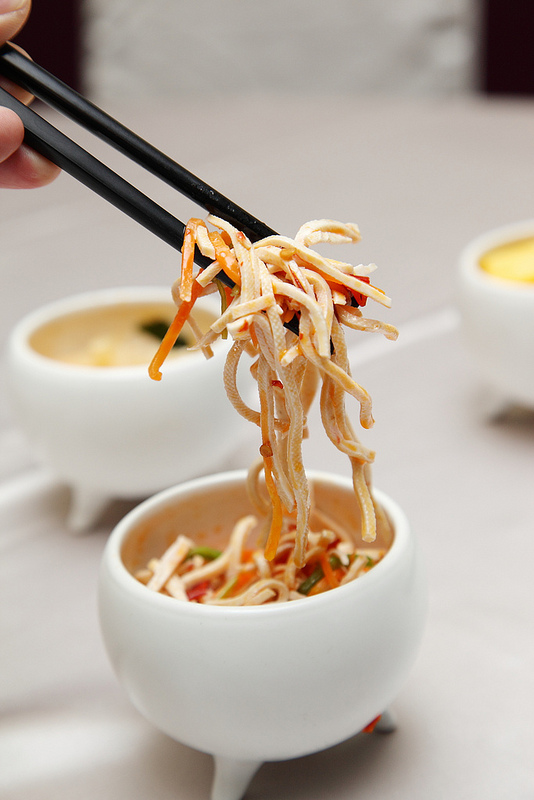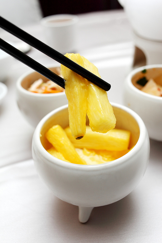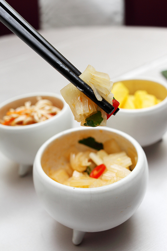 三品前菜(百香山藥,涼拌大頭菜,凉拌干絲)用精緻的白瓷小鼎盛裝
