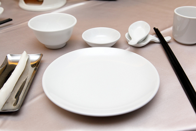 白淨素雅的杯盤碗瓢,整整齊齊的排放在座位前