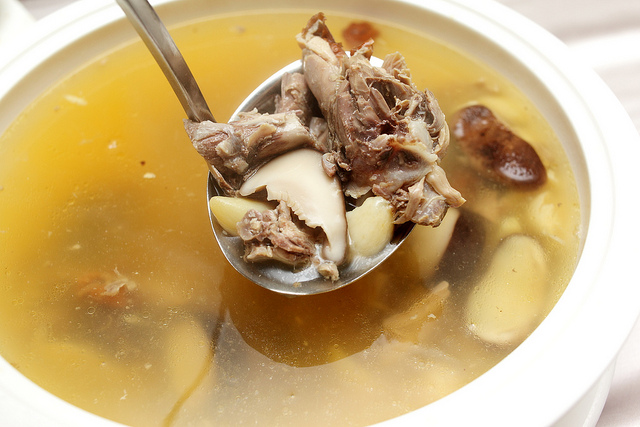 雞骨也不能浪費,主廚加入蒜頭,香菇熬成蒜頭香菇雞湯