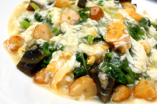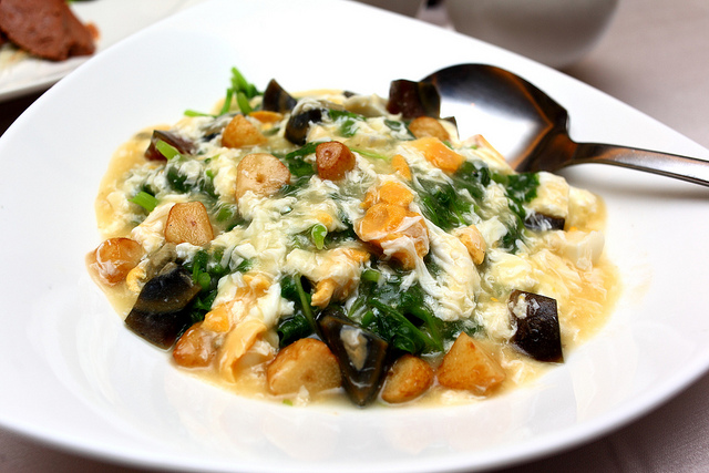 加入鹹蛋,皮蛋以及炸的金黃蒜頭一起燴炒,金銀黃黑,色彩繽紛
