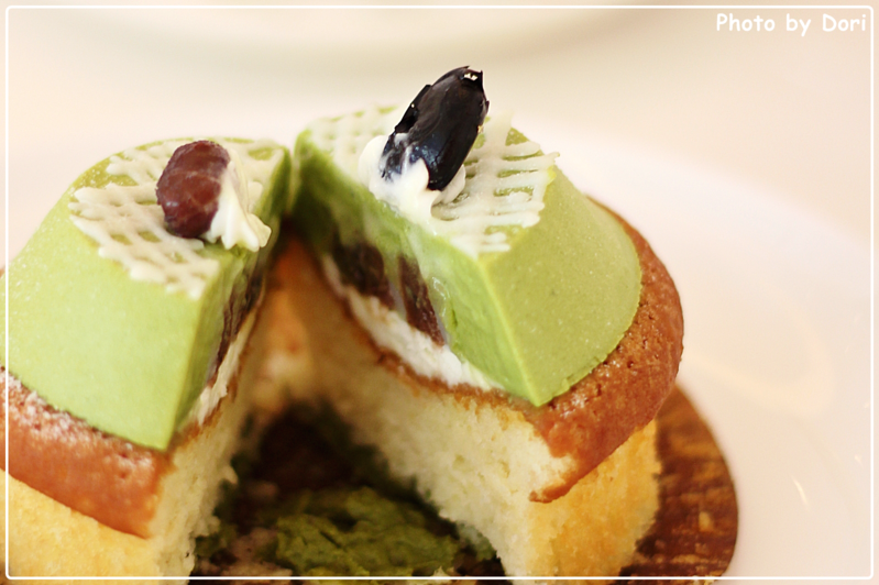 表層上方放置了蜜漬紅豆、黑豆裝飾,順著薄片白巧克力與抹茶慕斯切下,可感覺到白巧克力的輕脆,但卻不會整塊碎掉。抹茶來自日本鹿兒島,慕斯綿柔一點也不硬。