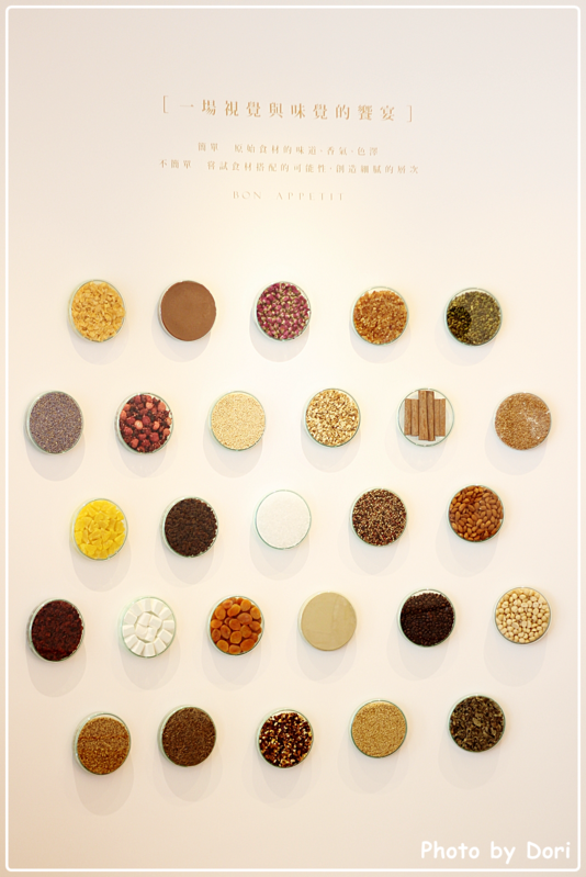 白色牆上寫著“一場視覺與味覺的饗宴”,掛著各式各樣製作杯子蛋糕的素材,讓人覺得蠻有意思。玫瑰花、肉桂棒、伊朗開心果、綜合苺果、棉花糖、杏桃乾等等,增添另一種不造作的生活美學。