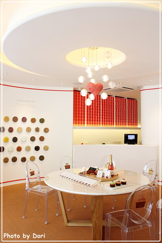 一入門便見到了與我聯繫的二位女孩,非常的開朗、親切招呼讓我感受到了她們的熱情。內部空間採圓形劇場式設計,白色的布幔、簡約的色彩顏色與外觀相互呼應,很喜歡的是那張木質調的大圓桌,彷彿有種讓人凝聚在一起及歐式花園午茶的想像空間。當然,我們也正同樣走進了杯子蛋糕的世界,這也是設計概念原理之一。