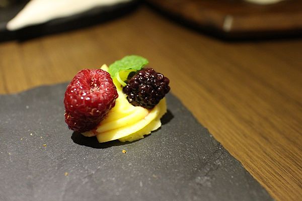以糖霜撒出品牌logo,小奶油拉花上一顆紅莓果一顆桑葚,小動作小心思,讓客人注意到就是一分驚喜和加分