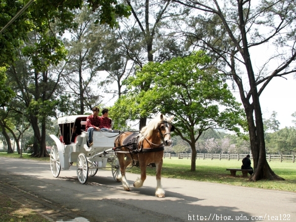 埔心牧場自46年成立至今,園區內夾道的樹木已然自成綠色隧道,即便已正中午,行動絲毫不被烈陽所困,遠遠一輛馬車在綠蔭中奔馳而來,忙不迭的快拍下來,這才發現車上原來還載著一對新人,像是被幸福仙子灑下的喜氣所感染,嘴角的笑容不自覺的展露出來,多麼美好的一刻。