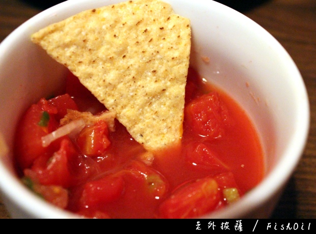 這個莎莎醬是整碗沾著吃的,跟上面整盤放在上面的口感相比,