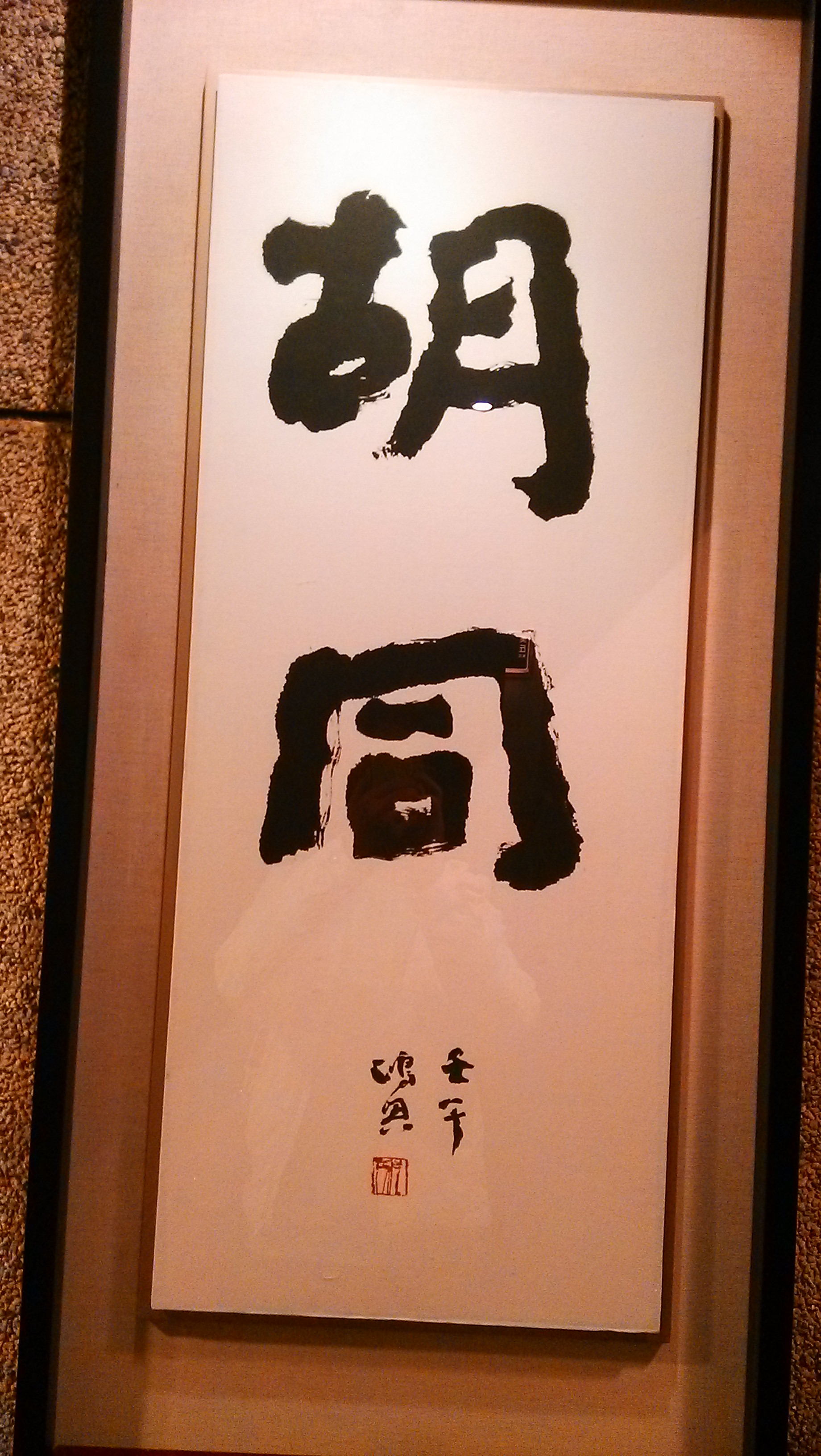 難得的春日暖陽,騎車到久違的精明商圈,尋覓一家藏身巷弄的個性咖啡店-胡同。胡同其實並不若想像中難以尋覓,店外以一面斗大的國旗取代顯眼的招牌。據說國旗的設置意味著顧客在"國定假日"時,可邀三五好友結伴,或個人光臨胡同飲茶、飲咖啡,享受假日難得的閒適。到達胡同的時間約莫是下午四點左右,天色仍亮,店外有兩處露天座椅,若天候佳,不妨選擇樹下的位子與朋友促膝閒談。胡同的黑色大門為L型的設計,密合在建築物邊角上,大門掩著時,對於初次造訪的來客,有種不得其門而入的神祕感!幸虧老闆及時過來為我開門,一解尷尬!走進胡同,映入眼簾的是右方榻榻米的座位區,因榻榻米區緊鄰窗邊,所以採光較佳,可惜已滿座,所以只好望向左方的座位。本來選擇的位子是適合個人或雙人的小桌區,但覺光線實在太暗,故詢問了店員能否選擇二樓的位子。很幸運的,因是假日,所以二樓的榻榻米座位是開放的。或許是因為清明假期,大家都出門旅行去了,我個人揀選了窗邊明亮的位子,獨享二樓寧靜微涼的空間。一二樓樓梯間也有一幅鴻興先生的書作"美丘",這幾個書法字的風格,是我更年輕時無能欣賞的,隨著年紀漸長,現下的心境已懂得欣賞這種饒富拙趣禪意的風格。
