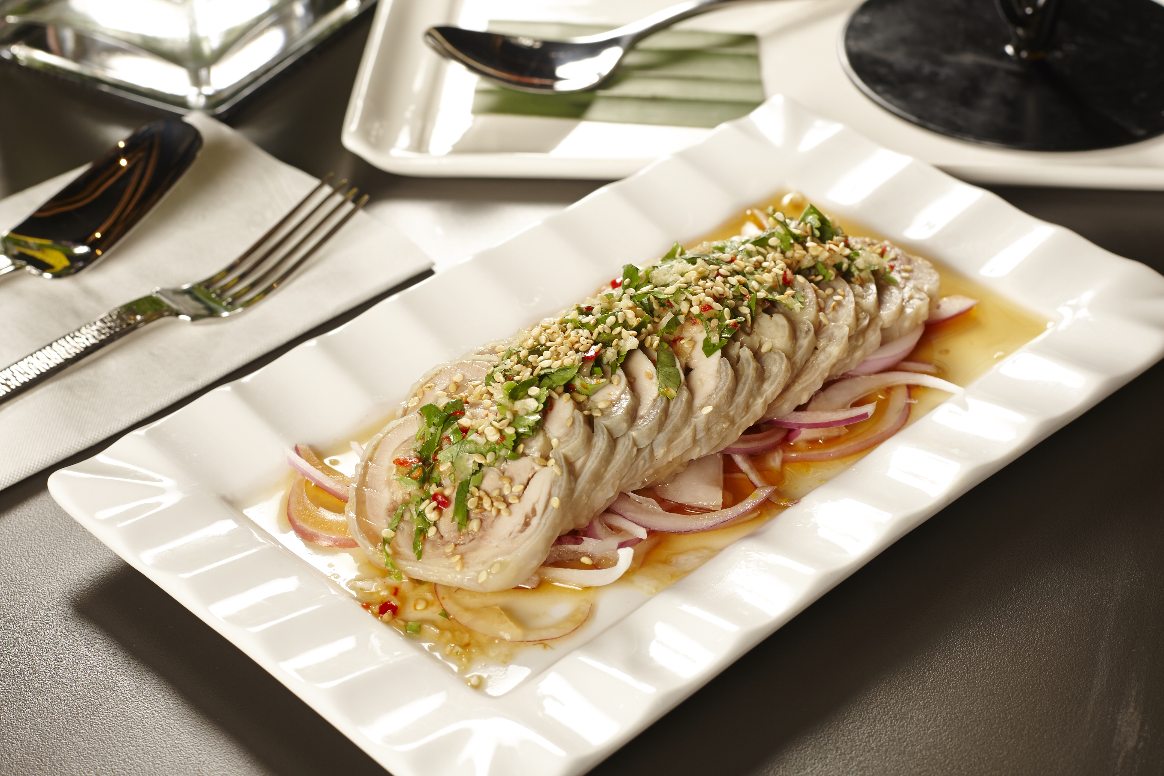 如同醉雞的Q嫩口感,淋上泰式酸辣醬汁,並灑上生辣椒、蒜頭、香菜、白芝麻在上頭,增添其風味,搭配鋪在底下的生洋葱一同入口,口味清爽開胃,讓不能吃海鮮的顧客也能品嚐酸辣涼拌的美味。