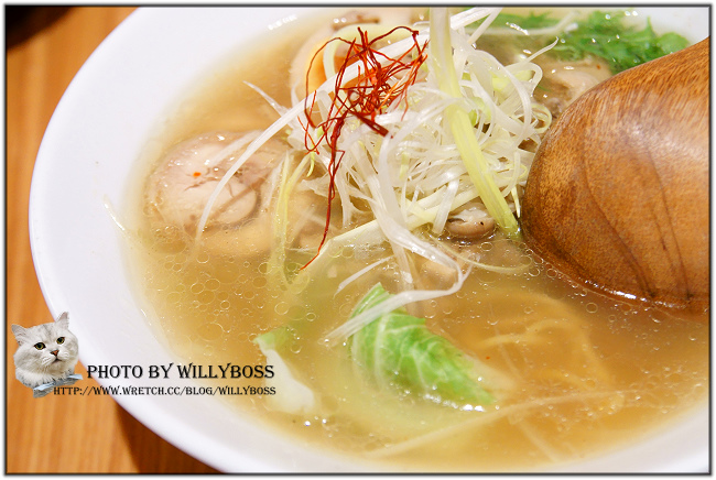 朋友的特製鹽味拉麵220元(忠孝店限定),看起來十分清澈的湯頭,是用土雞和一些蔬菜跟干貝等等海鮮熬製而成,喝起來很像是鮮美的雞湯哩!鹹度也很恰到好處,只是吃起來會讓人聯想到什麼中式的麵XD。