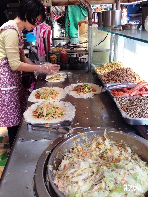 裡面的料除了主要的高麗菜 豆芽菜 還有蛋皮 芝麻 花生 糖粉 叉燒肉 香菜等等