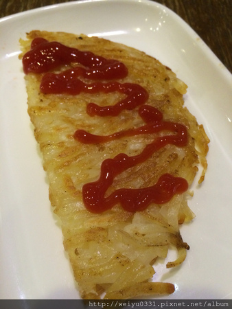 先來一個硬要單點的薯餅,整個有點小普通,不過比較不像一般早餐店的薯餅,有很細的馬鈴薯痕跡,感到真實。