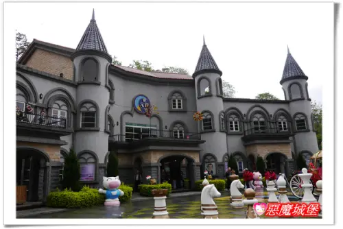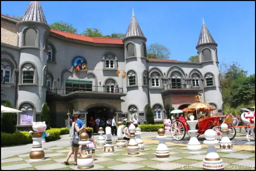 城堡的門口有個用地板與綠草地分隔出的大棋盤,上頭放了許多巨大的西洋棋子,棋子分為黑、白兩色,黑色的棋子看起來特別有氣勢,白色則感覺較為清新,每顆棋子都有不同的造型,這是別的旅遊景點不曾見過的,超特別唷!!