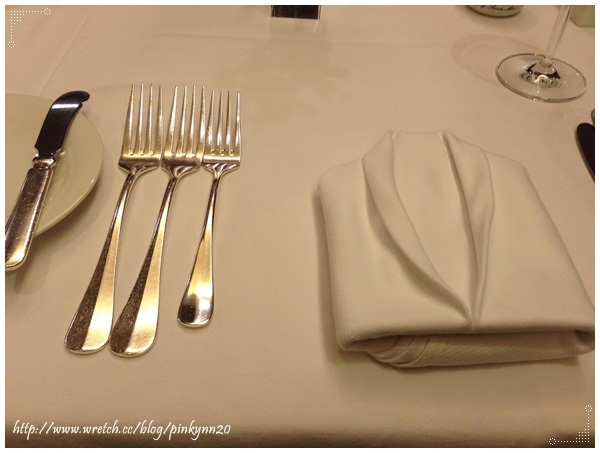 每人位子上都放著整齊的餐具,以及摺成衣服造型的餐巾