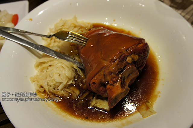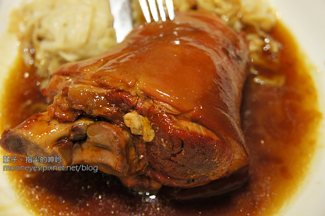 底下襯著入味的高麗菜絲,搭著肥嫩的蹄膀,相得益彰。