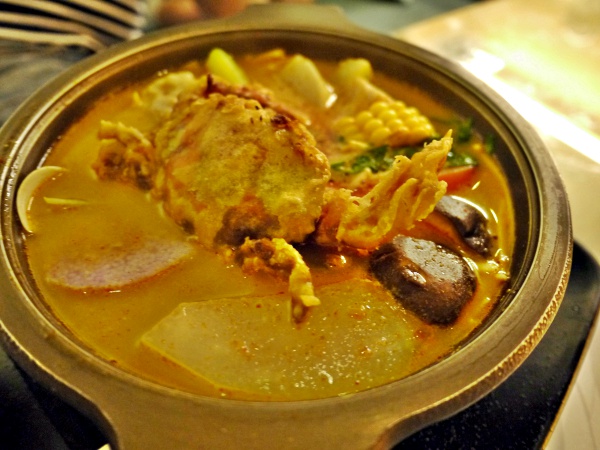 沒多久,這水深火熱的軟殼蟹便上桌。鍋底採南洋咖哩風,加上多樣當季時蔬熬煮。