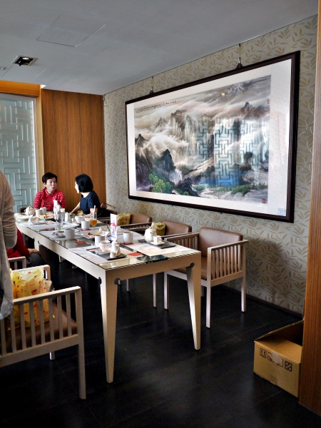 大空間的兩長桌,適合團體聚會,足夠的採光與雅致的字畫,人的線條自然和緩。