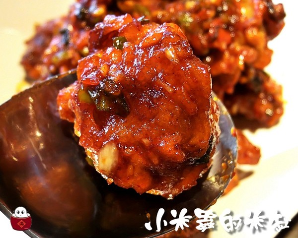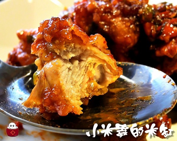 炸過的雞肉裹上紅通通的醬料,加上爆香過的蒜末跟辣椒
