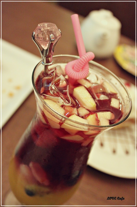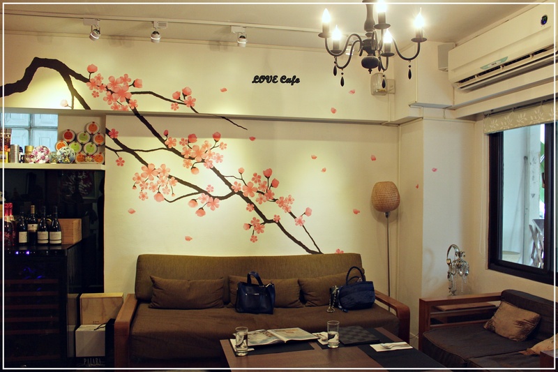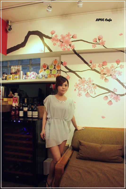 這是那天我們的座位 三個人坐L型的沙發耶 好輸胡的 剛好後面這片牆是櫻花啊 好美唷