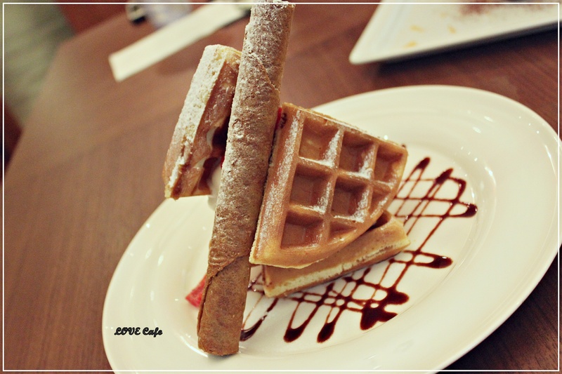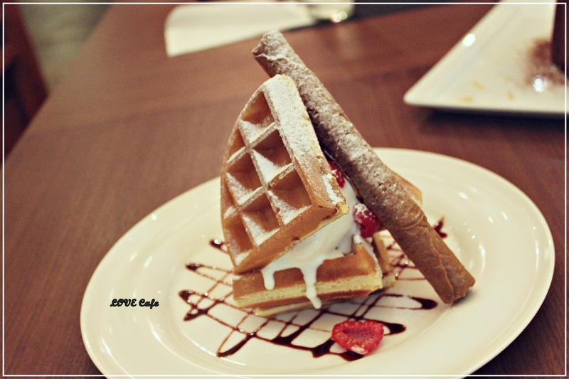 重頭戲二 牛奶糖鬆餅登場 厚實鬆餅 裡頭有一球冰淇淋 再附上一隻咖啡蛋捲點綴