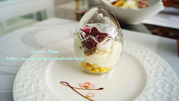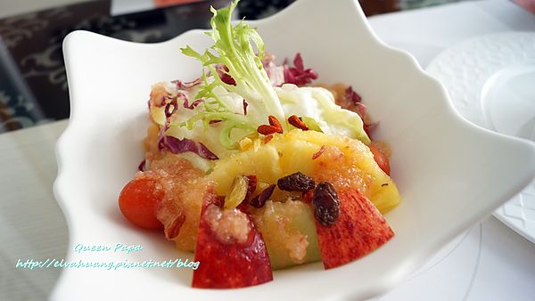 今天提供的是海鮮沙拉~ 鮑魚切條當主角!層層的蔬菜堆疊~ 前菜的沙拉醬有淡淡芥茉香氣!盤上的梅花是手繪的