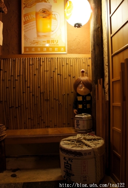 夜幕低垂,華燈初上,台中大墩14街與大福街交叉口,一盞紅燈籠悄悄地亮了,若非熟門熟路之人,斷然不會發覺,這可是老台中人才知道的秘密基地。整個外牆就像是頽廢多年的工廠,密不透光,直到開啟的瞬間,室內昏黃的燈光,竹編仿古的日式建築,令人頓時有若掉入時光隧道,牆角邊的鬼太郎、櫃台後的酒櫃,每個角落中都有引人入勝的巧思。