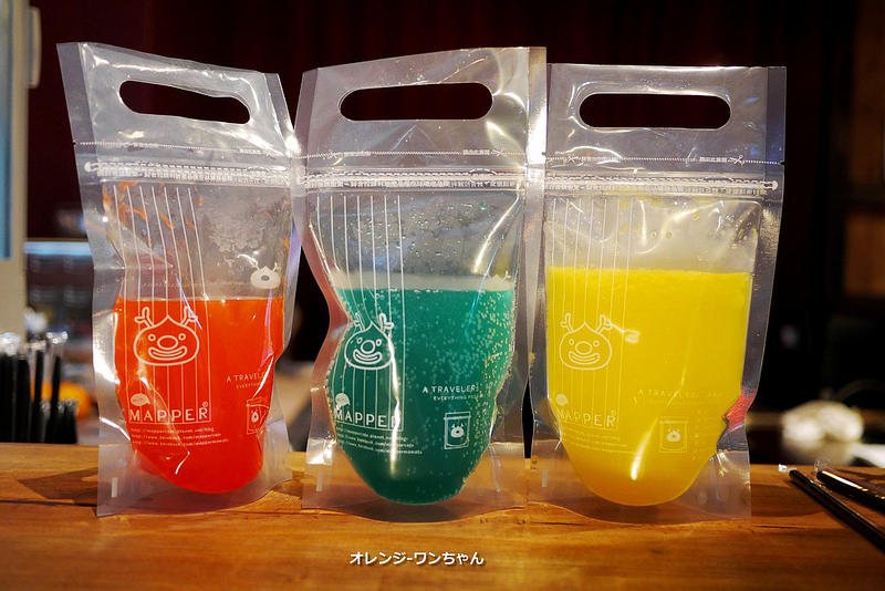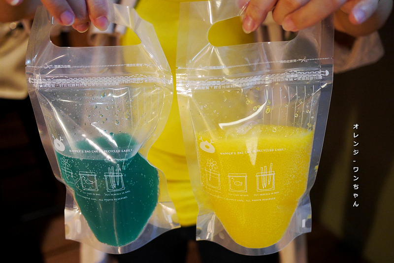 特別的就是盛裝調酒的袋子..是個透明加上插圖設計的夾鏈袋..上面還有個小小提把..