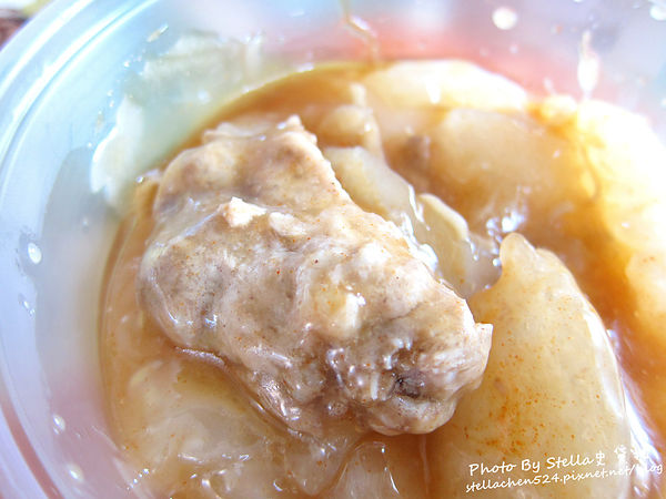 肉是屬於塊狀厚實的豬肉,醃漬入味!!
