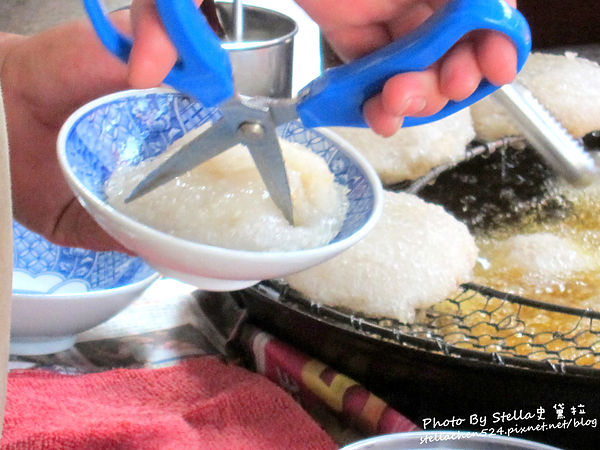邊排隊邊看老闆身手俐落的把炸熟的肉圓剪開