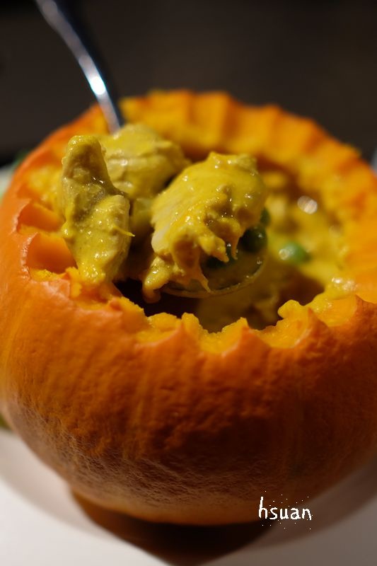 店家用了整顆南瓜將咖裡還有雞肉放置到南瓜中
