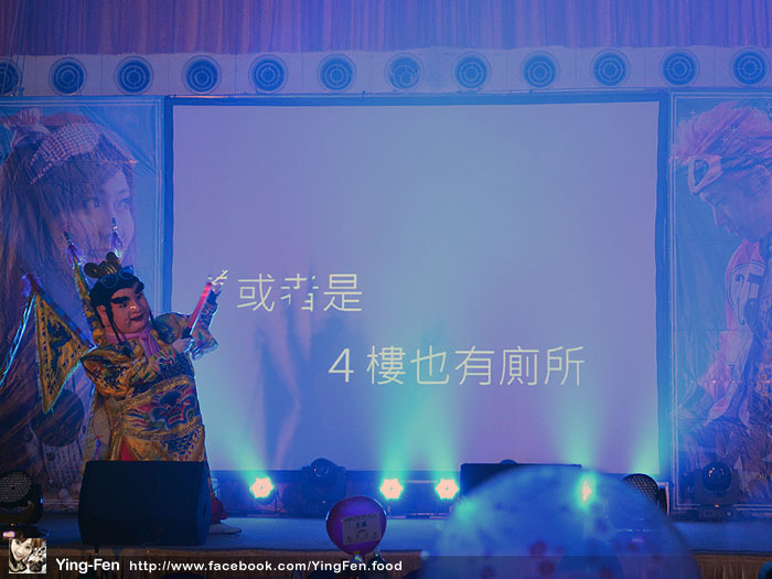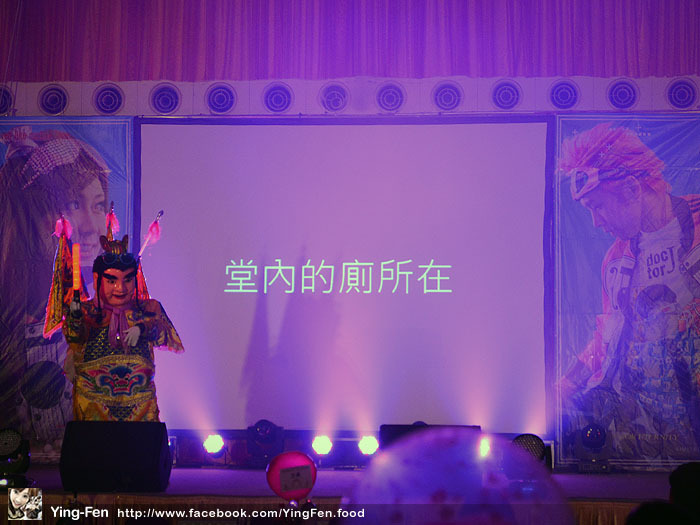 婚禮開始,上面舞台有三太子在跳舞,還說明大家最想問的問題,就是廁所在哪?看到字幕就知道了。