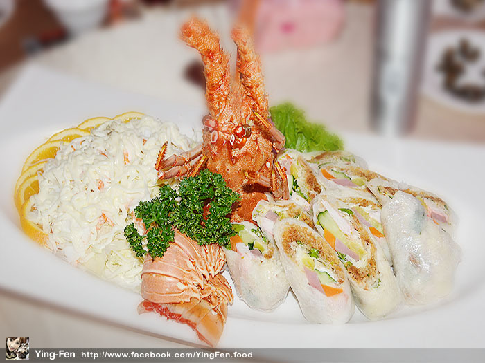 龍蝦上面有滿滿沙拉醬,下面都是生菜,龍蝦肉吃起來非常鮮甜可口,很嫩又多汁好好吃。