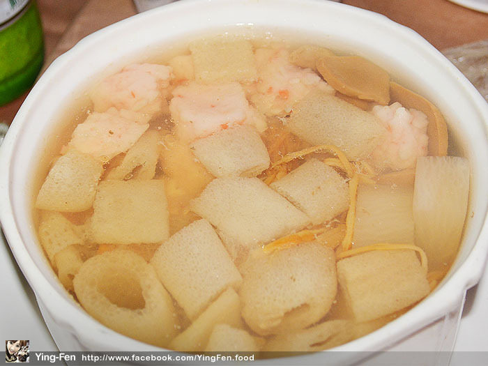 桌上的菜還繼續出,這裡面看起來好有營養,有菜、魚皮、香菇和我最愛的魚翅,湯頭味道很香,感覺像是高湯熬煮很好喝。