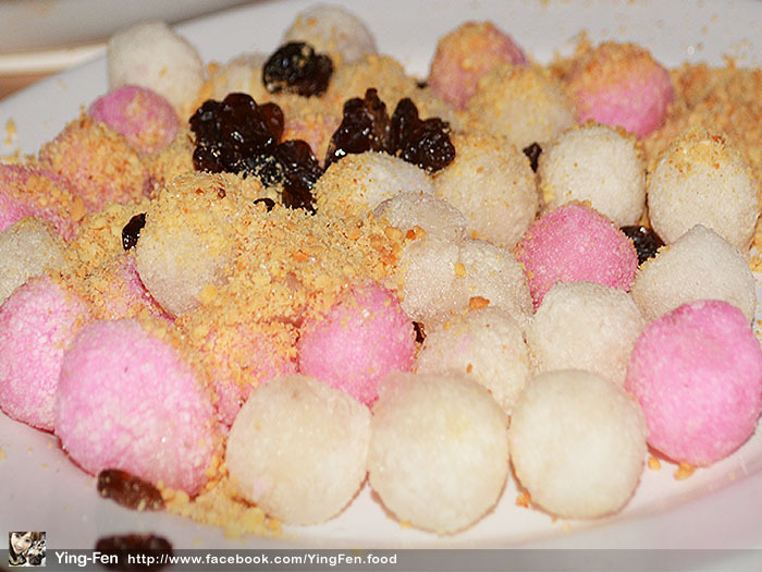 每次參加朋友婚禮一定都會吃到,湯圓外表炸的很酥脆,裡面而是軟的口感,很香甜的味道,上面有加少許的葡萄乾和花生粉。