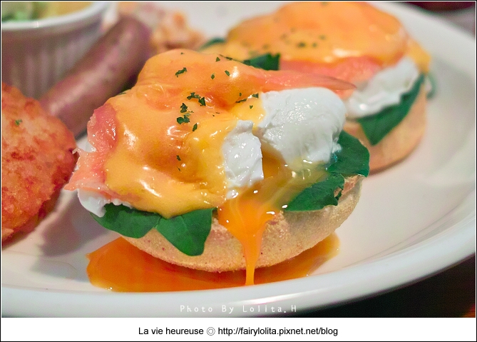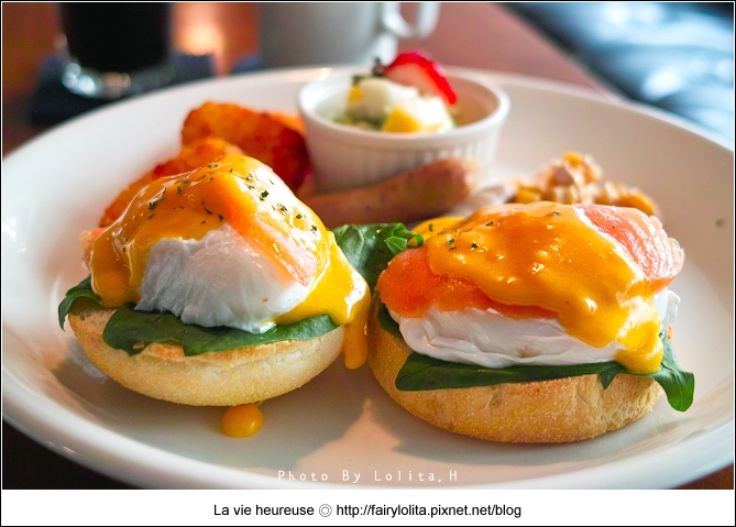 就是這種黃澄蛋液啦!會把水波班視為心頭好不是沒有原因的呀!>///< 佐以略酸濃稠的荷蘭醬一塊吃最適合了,唯獨鮭魚的厚度薄了一些,小小有點不滿足囉!