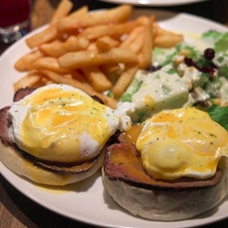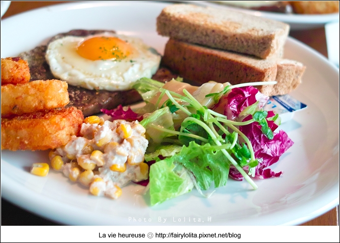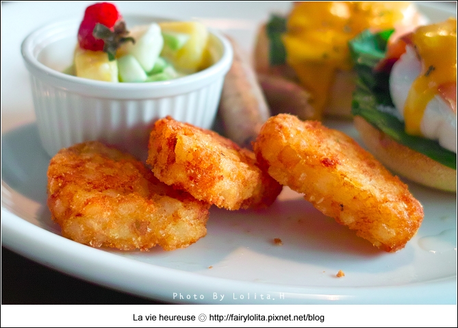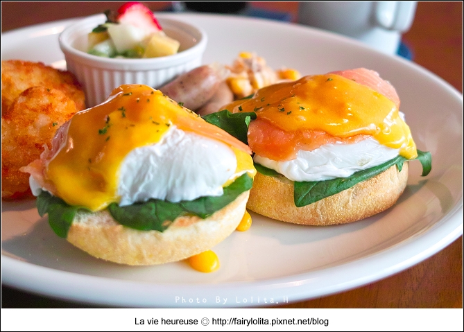 雖然每次造訪早午餐店,總是會想嚐嚐不同的菜色,但不知怎麼的,最後還是投入班尼迪克蛋的懷抱,只能說我實在太愛這一味囉!:)配置的食材有水果沙拉、義式香腸及薯餅,也許有了荷蘭醬鮮豔的色澤,看起來似乎特別地美味。