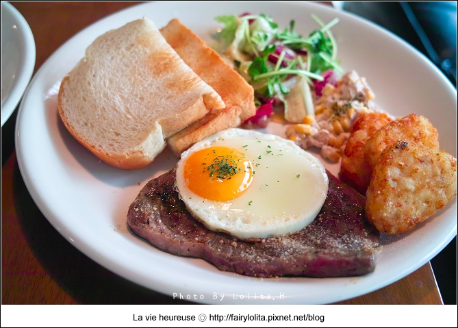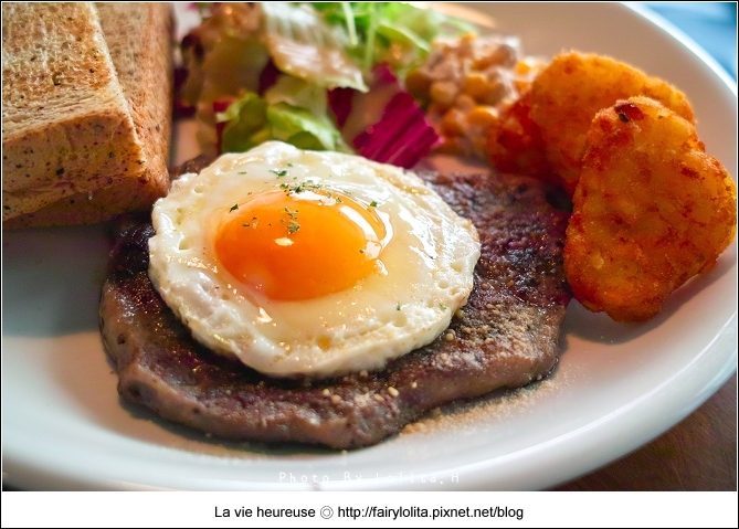 這是所有早餐組合中最豐盛的一道,當然價格也是最高的,香煎雪花牛排佐以帕馬森起士,再搭配太陽蛋、薯塊、沙拉,以及全麵吐司,份量適中,走以較為精緻的路線。