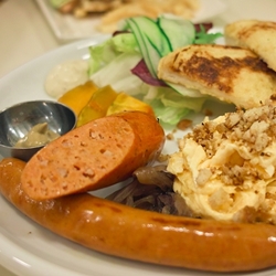 這個組合有歐姆蛋及時蔬歐姆蛋兩種選擇,價差約莫40元,附加食材有義式香腸、水果沙拉、薯餅、全麥吐司,如不喜全麥,也有白吐司可以選擇。