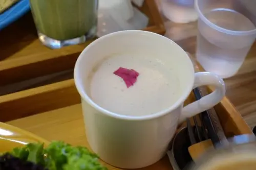 卡布其諾濃湯,上面加了綿密的奶泡,與濃湯搭配起來喝,也讓人胃口大開,很少喝湯的我也喝光了,加上料也蠻多