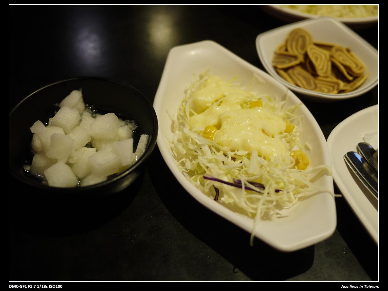 上桌就提供一人一份沙拉, 一小盤醃蘿蔔, 和豬耳朵(餅乾), 醃蘿蔔很好吃唷! 酸酸甜甜很入味, 吃完還可以再點, 這是店家的招牌唷!