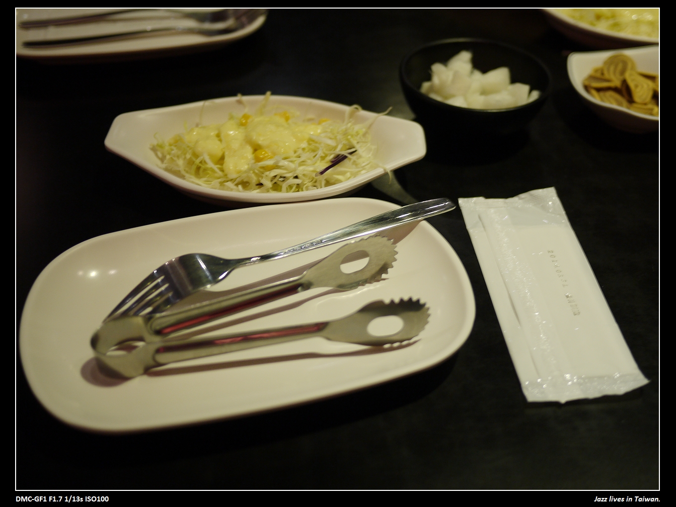 餐桌上備的餐具則是一個餐盤外加一把叉和一支夾子,