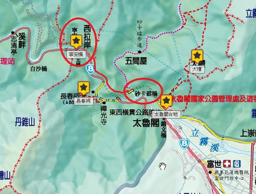 從<遊客服務中心>離開後沿著路沙卡噹隧道走,出了隧道就是 沙卡噹大橋,左前方有一個小型的停車場,