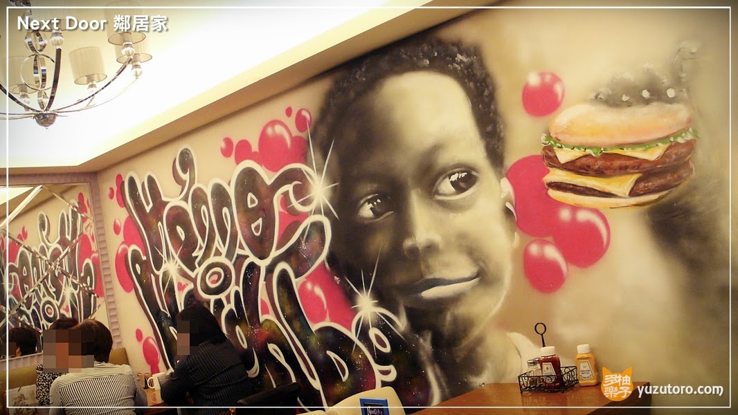 很喜歡店裡的佈置與牆面繪畫,尤其是從窗外就可以看到的外國小朋友閃著晶亮的大眼睛、準備大口咬下手中漢堡的這一幅;“雙層牛肉”起司“大”漢堡耶!要是我們看了也會跟小朋友一樣眼睛發亮!
