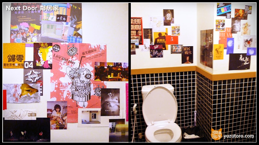 男廁裡牆上是貼活動或是議題的小海報、酷卡;女廁牆面則是貼繽紛的手作小花,也有貼心的在洗手台上附裝有棉棉的小木盒。如果門外沒有其他等候的人客,解放後倒可以好好欣賞一下。