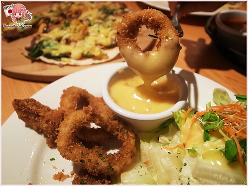 開胃菜之一的餐點,是用整隻花枝切開裹粉下去炸,