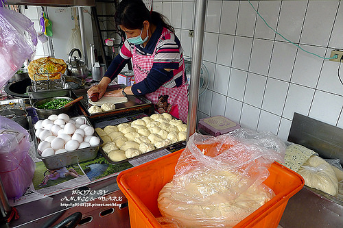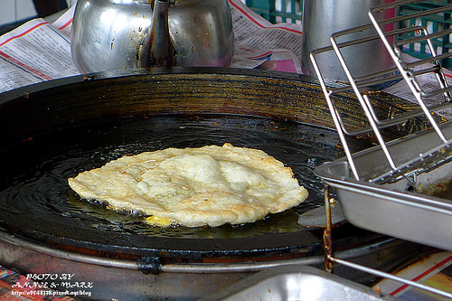 這可是現擀麵糰,現煎的,沒三兩下,劈哩啪啦就下鍋,動作可熟練得很啊!